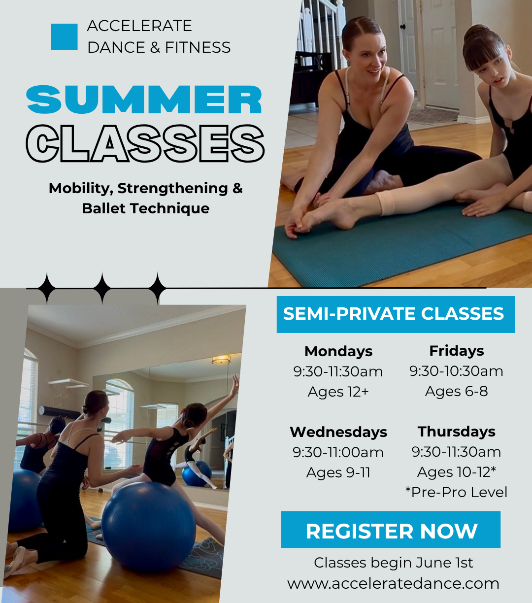 Accelerate Dance & Fitness offers semi-private classes (2-4 dancers) throughout the summer. During these classes, we will focus on mobilizing areas that are tight, targeted strengthening to help balance the muscles, and basic class technique so that they can apply these techniques to their dancing. Class will be customized to the dancers attending each class so that they are truly getting the tools they need to succeed